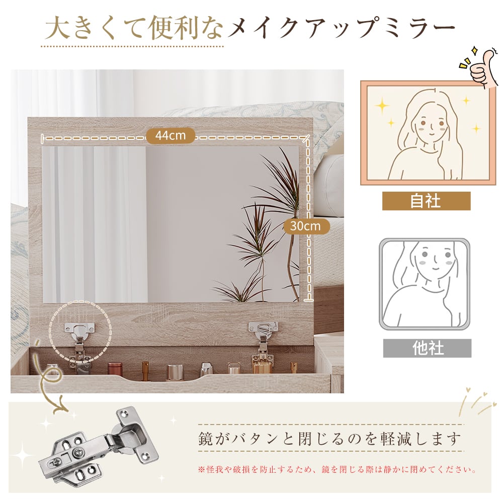 W44cm × H30cmの大きな鏡でメイクも快適。顔全体がしっかり映ります。