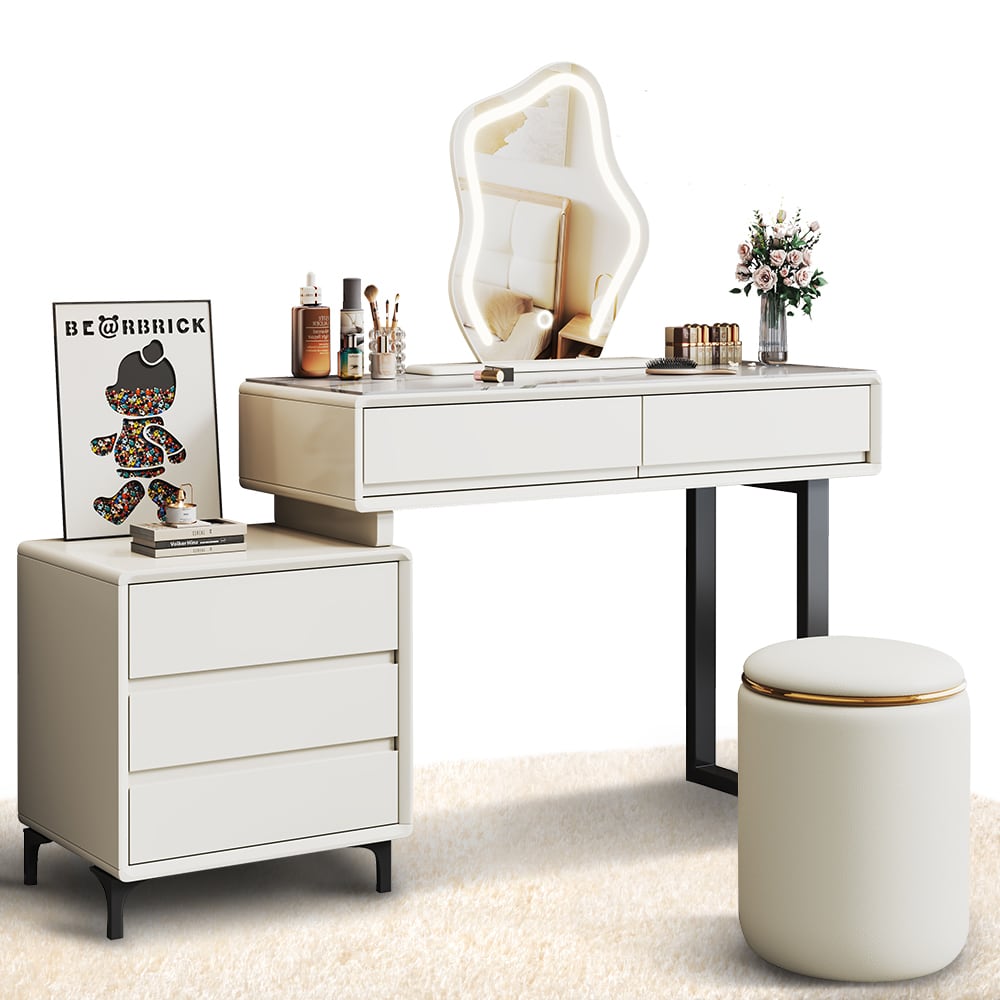 Tiktok ドレッサー 大型 100cm幅員 岩盤天板 スツール付き テーブル おしゃれ 大容量収納 クリーム風 10段階明るさ調整可能 3色LEDミラー 新型 化粧台【d16-mc】