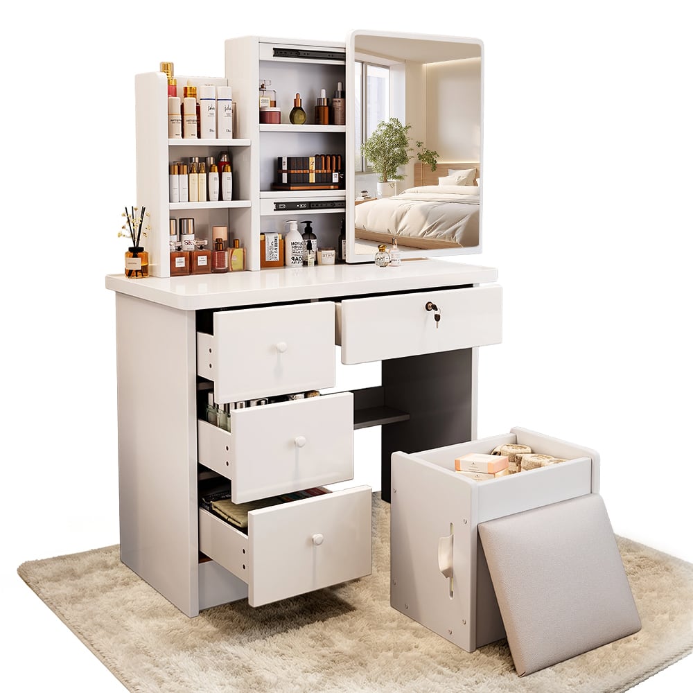 【1000円クーポン付き】ドレッサー コンパクト おしゃれな スライドミラー付き 大容量収納ドレッサー|省スペース設計・スツール付き V02