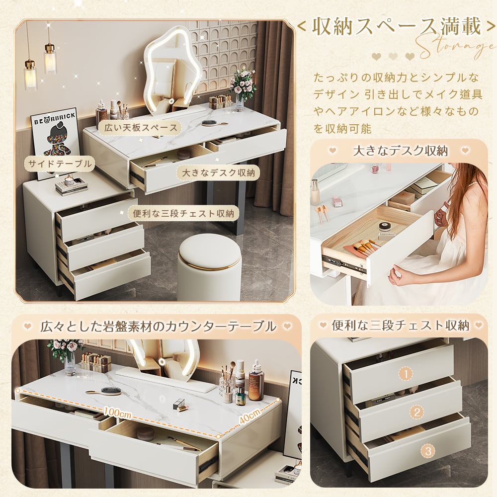 【1000円クーポン付き】 ドレッサー 大型 100cm幅員 岩盤天板 スツール付き テーブル おしゃれ 大容量収納 クリーム風 10段階明るさ調整可能 3色LEDミラー 新型 化粧台【d16-mc】
